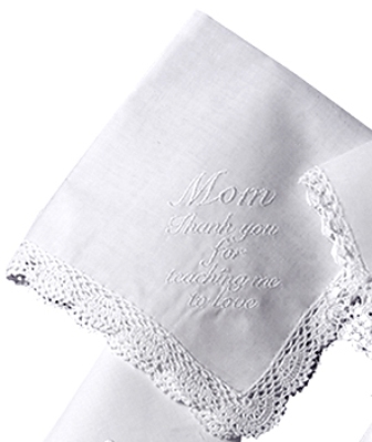 "Mom Thank you for teaching me to love" embroidered handkerchief White cotton hanky. Boxed and tied with white satin ribbon 12" x 12" size hanky.